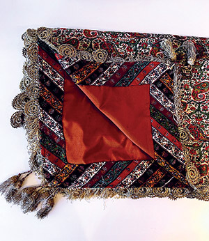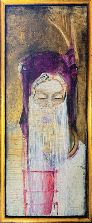 A painting from Marjaneh Afkhami’s Queen Series, acrylic on canvas and framed, measuring 12 x 30 inches. This series celebrates women, inspired by strong historical figures across civilizations and tribes. Each piece does not represent a specific individual but embodies the concept of a prominent matriarch, balancing the weight of societal and cultural pressures while using her role to hold society and family together and advocate for the rights of women and children. It reflects an age-old story of resilience and strength that continues to resonate today.
