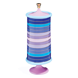 Introduce a splash of retro-inspired elegance to your home with the Scala Vessel and Scala Canisters set, a vibrant duo designed to elevate any decor. Wrapped in 60s-inspired concentric squares and geometric stripes, these porcelain pieces feature a cool palette of blues and lavender, accented by luxurious touches of shiny gold. The classic forms of the vessel and canisters exude modern sophistication, ideal for styling on a mantel, coffee table, or as part of a striking tablescape.