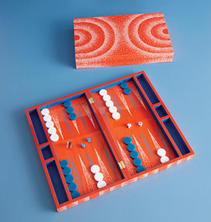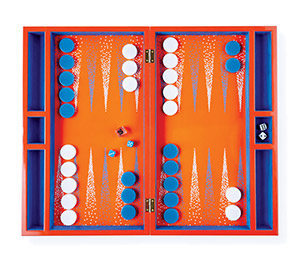 Add a splash of vibrant Art Deco style to game nights with Jonathan Adler’s Vapor Backgammon Set, a striking blend of timeless elegance and playful modernity. Inspired by 1930s airbrushing techniques, this couture lacquer set features bold geometric patterns in vivid orange and blue, making it a true conversation piece.