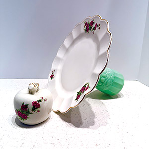 The stunning Golesorkhi serving dish, paired with a decorative pomegranate from Diyar Concept Store, combines modern elegance with traditional Iranian artistry. Measuring 7 inches tall with a 10.5-inch diameter, the dish features a delicate, rose-inspired design that makes it a striking centerpiece. Set on a wine-glass-shaped stand, its organic pattern is beautifully showcased. The decorative pomegranate complements the intricate design, creating a cohesive and elegant set.