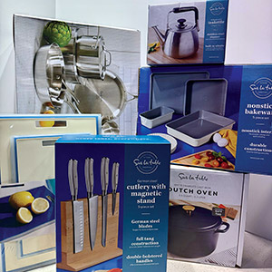 Enhance your kitchen with this 26-piece collection of premium cookware and accessories from Sur La Table. The Sur La Table Pine and Pike 12-piece stainless steel tri-ply cookware set features silk satin interior and exterior finishes, stainless steel lids, and cast handles. The SKE SpecialTea 1.9-quart brushed stainless steel teakettle includes a Bakelite handle and knob for comfortable handling. The Sur La Table Millau 5.5-quart Dutch oven boasts a matte marine exterior, an off-white interior, and a rose gold knob. The SKE Tasting Kitchen 5-piece cutlery set includes a beechwood magnetic stand, eggshell-colored plastic handles, and stainless steel blades. The SKE Bake Sale 5-piece bakeware set offers nonstick carbon steel pieces in eggshell and gray, while the SKE Mess Hall cutting board set includes two rectangular boards (17” x 12” and 13” x 9”) in eggshell and marine, with a durable polypropylene base.