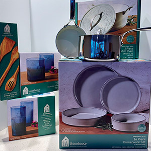 Upgrade your kitchen with the eco-friendly 48-piece collection from Bloomhouse by Daniel Gabbay. This set includes a 12-piece cookware collection in matte sage with a white ceramic nonstick interior, an induction base, cast handles, a 7-quart Dutch oven with an embossed leaf lid, a silver cast stainless steel knob, and a wooden trivet, as well as a 3-piece olive wood utensil set. Also included is the Santorini Mist 16-piece double bowl dinnerware set in Moonstone, featuring a reactive glaze and terracotta accents; an 8-piece tumbler and coaster set in Lyon Sky made from handcrafted lapis-colored glass (18.5 oz tumblers); and an additional 8-piece coaster set in Lyon Sky (15 oz). Elevate your cooking and dining experience with these beautifully designed, sustainable kitchen essentials.