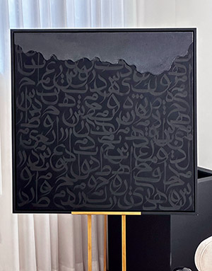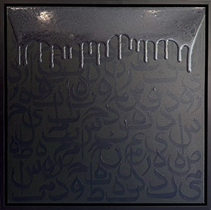 This framed mixed media painting on canvas presents a captivating interplay of Persian calligraphy, with shades of black letters flowing gracefully across the canvas. Each meticulously crafted letter seems to carry its own story, while collectively evoking a deeper reflection on the art of storytelling itself. The work invites viewers to pause, allowing the letters to reveal their own tales and encouraging contemplation of the unfolding mysteries within our destinies. Glistening resin, delicately dripping over the intricate calligraphy, enhances the piece’s visual allure, symbolizing the fluid, ever-evolving nature of our personal narratives. Measuring 36x36 inches.